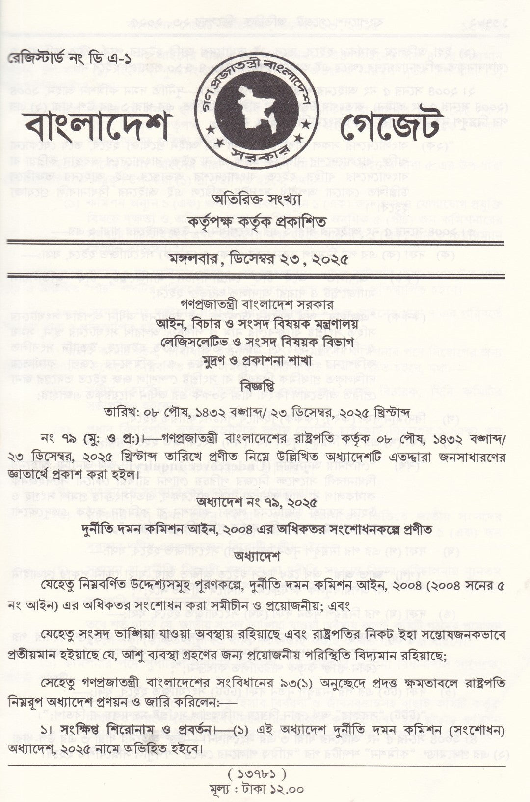 Inform when this item available দুর্নীতি দমন কমিশন আইন ,বিধিমালা (সংশোধন) অধ্যাদেশ,২০২৫